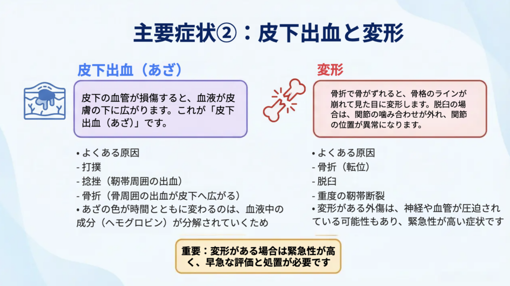 外傷では、見た目の変化も重要です。特に、変形・あざ・腫れの程度は、骨折や靱帯損傷などの可能性を考える材料になります。