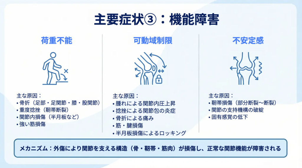 主要症状③:機能障害(荷重不能・可動域制限・不安定感)