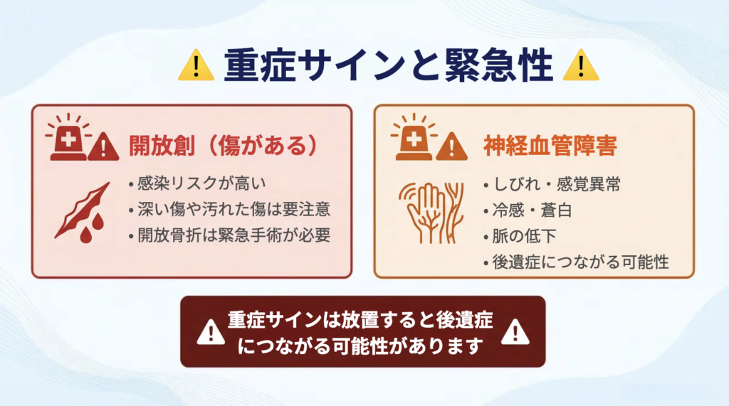 神経や血管の障害は、放置すると回復が難しくなり、後遺症につながる可能性があります。そのため、これらの症状がある場合は、外傷の中でも特に緊急性が高い状態として考える必要があります。