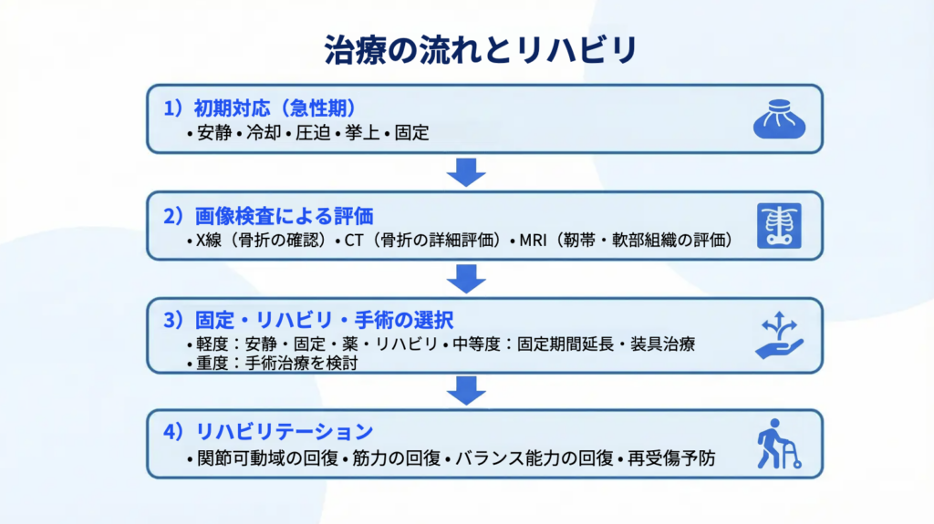 ・重度:骨折のズレが大きい、靱帯断裂が強い、関節が不安定などの場合は手術治療を検討