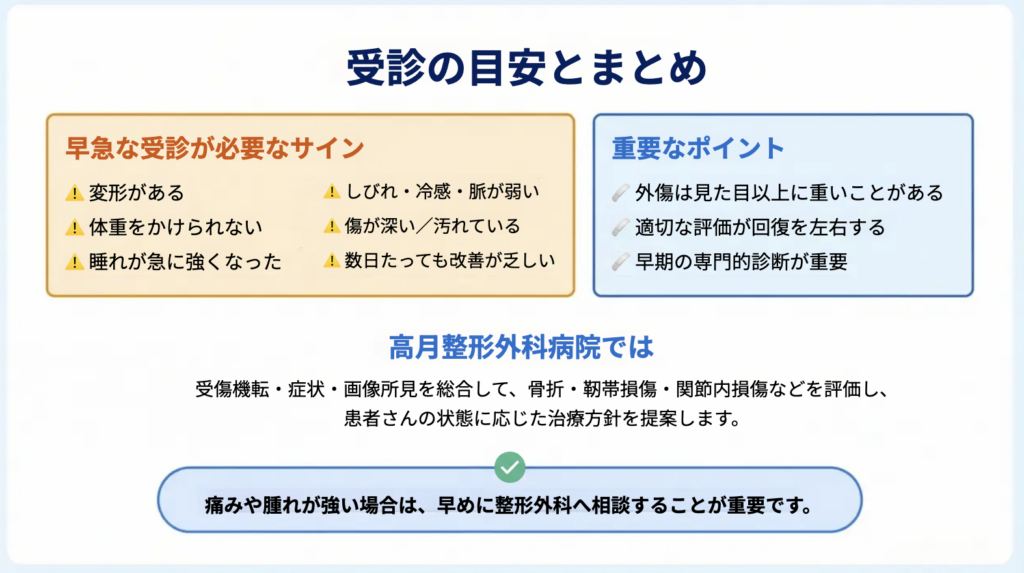 次のような症状がある場合は、外傷の中でも緊急性が高い可能性があります。自己判断で様子を見ず、早めに受診することが重要です。