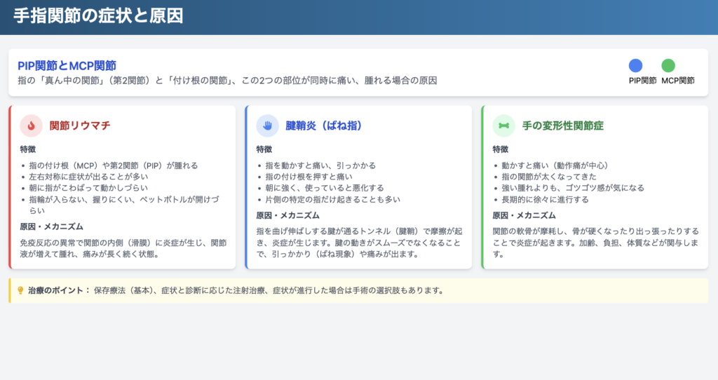 ここからは、PIP関節とMCP関節に症状が出るときに多い原因を、特徴とメカニズムに分けて解説します。