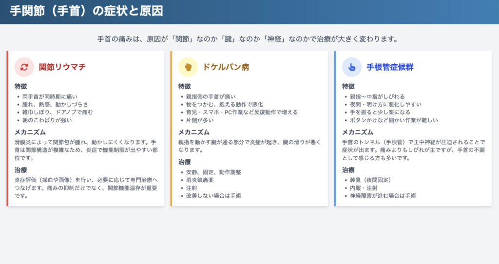 関節リウマチなどの炎症性疾患と、腱鞘炎・変形性関節症などの負荷による障害の両方が起こり得ます。