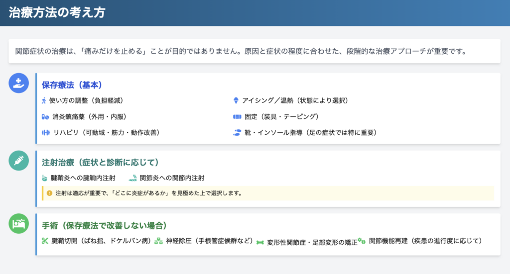 関節症状の治療は、単に「痛みだけを止める」ことが目的ではありません。大切なのは、原因(関節・腱・神経・炎症性疾患など)と、症状の程度(腫れ・機能低下・日常生活への支障)に合わせて、適切な方法を段階的に選択することです。