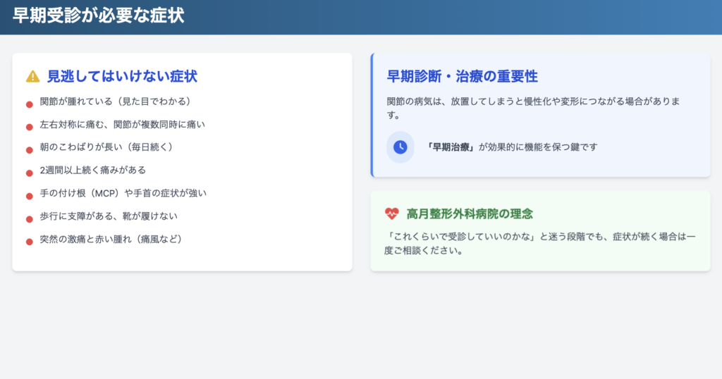 これらがそろう場合は、関節リウマチなどの炎症性疾患を含め、早めの評価が望ましいケースがあります。