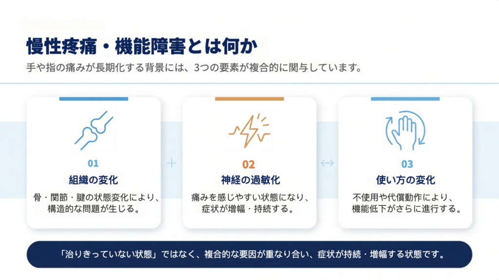慢性的な手の痛みや機能障害は、単に損傷した組織がまだ治っていないという意味ではありません。