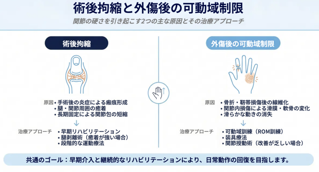 手や指の動かしづらさが長引く症状の中でも、特に多いのが術後拘縮と外傷後の可動域制限です。