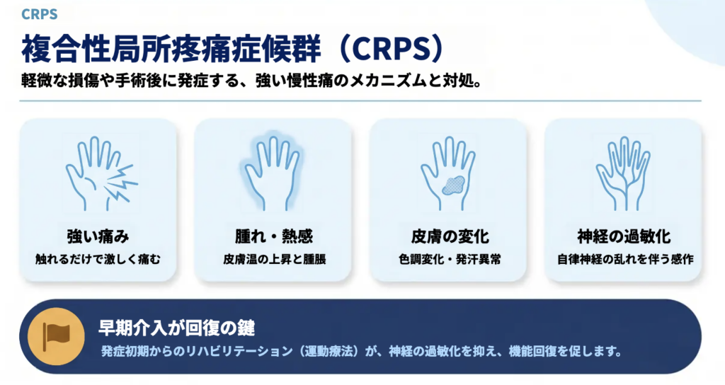また、慢性化した痛みでは、患部だけの問題にとどまらず、末梢神経の感作や中枢神経系での痛みの増幅が関与することがあります。これは、通常であれば強い痛みにならない刺激でも、過敏に痛みとして感じてしまう状態です。代表的な病態としては、CRPS(複合性局所疼痛症候群)が知られており、痛みだけでなく、腫れ、発汗異常、皮膚温や皮膚色の変化を伴うこともあります。