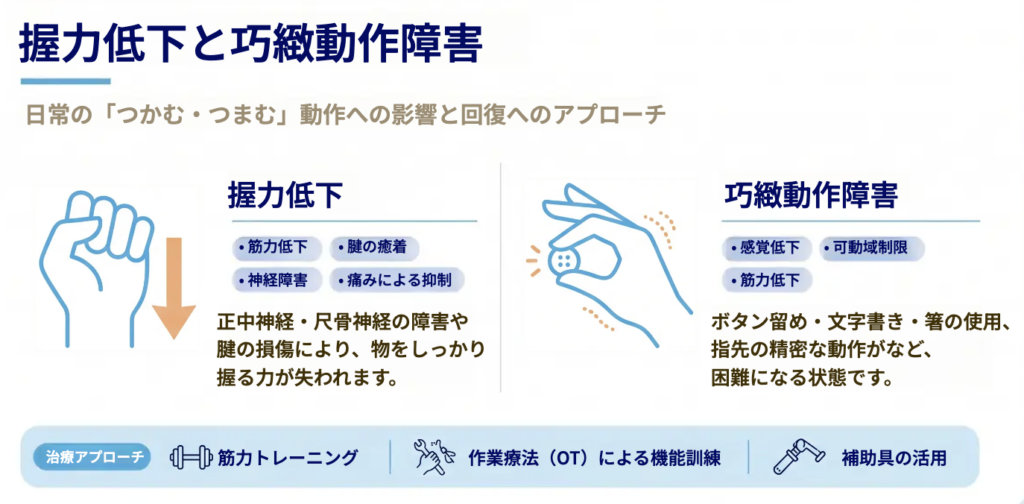 なぜなら、手の機能は単に痛みが減るだけでは戻らず、動き、筋力、使い方を再び整えていく必要があるからです。