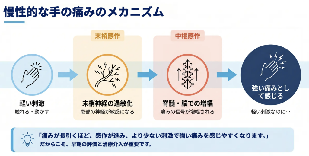 その結果、軽い刺激でも痛みとして認識されやすくなり、症状が増幅・持続しやすくなります。