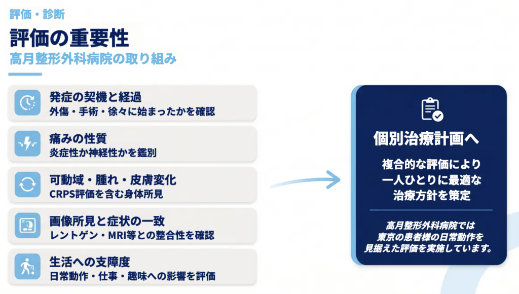 そのため、手外科では、痛みの性質、発症のきっかけ、可動域、腫れ、皮膚変化、画像所見、生活への影響などを総合的に確認し、症状の背景を整理していきます。