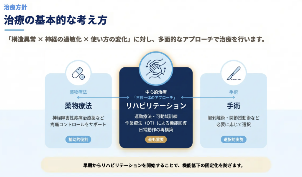 つまり、薬だけで根本的に機能障害を治すのではなく、手を再び動かしていくための土台を整える治療として位置づけることが重要です。