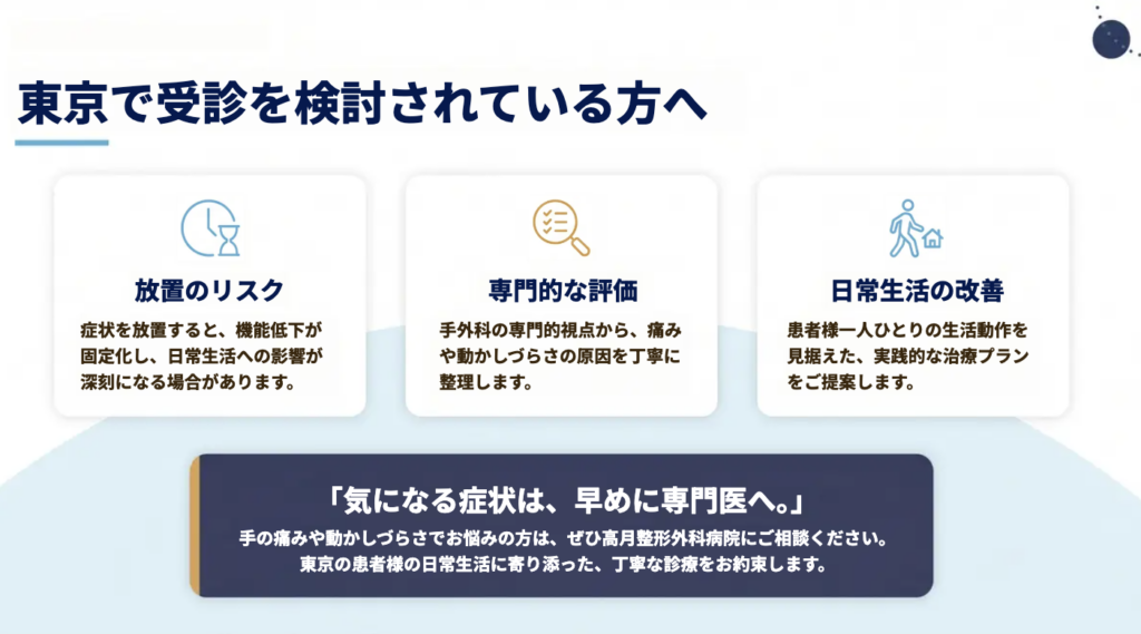 高月整形外科病院では、東京で手や指の長引く痛み、握りづらさ、動かしにくさに悩む患者様に対して、こうした複合的な背景を踏まえた診療を行っています。