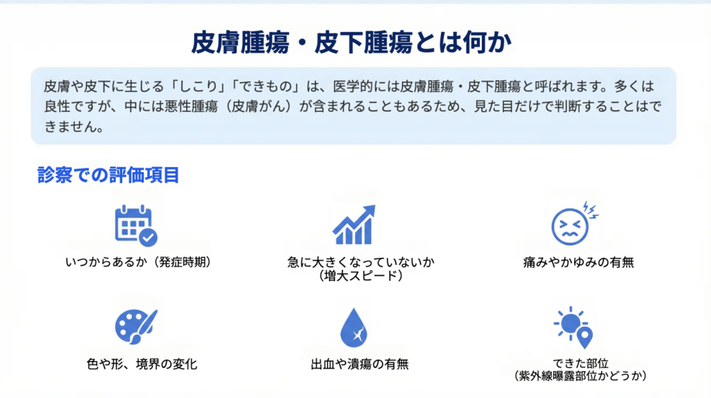 皮膚や皮下に生じる「しこり」「できもの」は、多くが良性である一方、経過や変化によっては慎重な評価が必要な場合もあります。特に、短期間での変化や皮膚の破綻を伴う所見は、悪性腫瘍(皮膚がん)の可能性も含めて判断する必要があります。