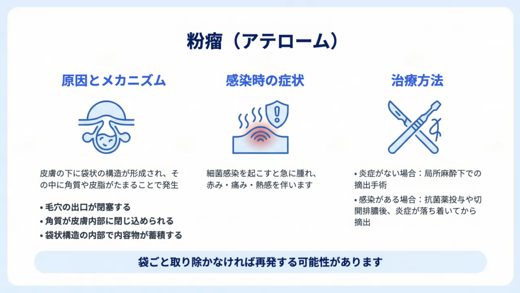 粉瘤(アテローム)は、皮膚の下に袋状の構造が形成され、その中に角質や皮脂がたまることで発生する良性の腫瘍性病変です。皮膚の表面から内部に向かって袋状の組織が伸び、角質や皮脂が排出されずに内部に蓄積することでしこりが形成されます。