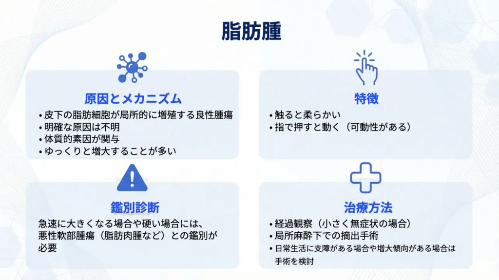 脂肪腫は良性腫瘍であることがほとんどですが、注意すべき点として、急速に大きくなる場合や、触診で硬さを感じる場合には、悪性軟部腫瘍(脂肪肉腫など)との鑑別が必要になります。