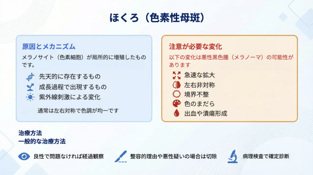 ほくろ(色素性母斑)は、メラノサイト(色素細胞)が局所的に増殖したものです。体表にみられる色素性病変の中でも頻度が高く、日常的に多くの方が自覚しています。