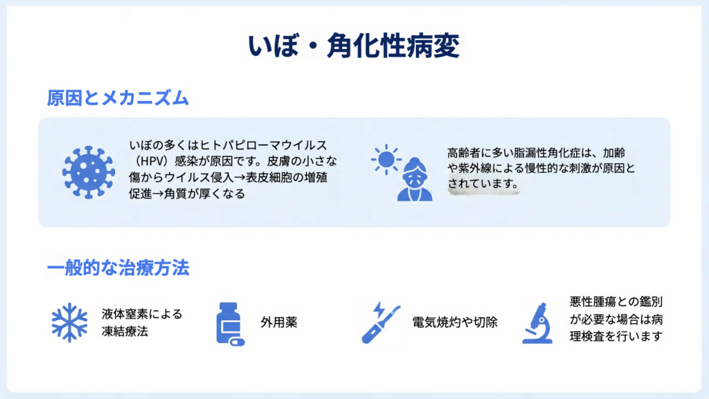 いぼ・角化性病変の治療は、病変の種類、部位、大きさ、症状の有無によって異なります。代表的な治療法は以下の通りです。