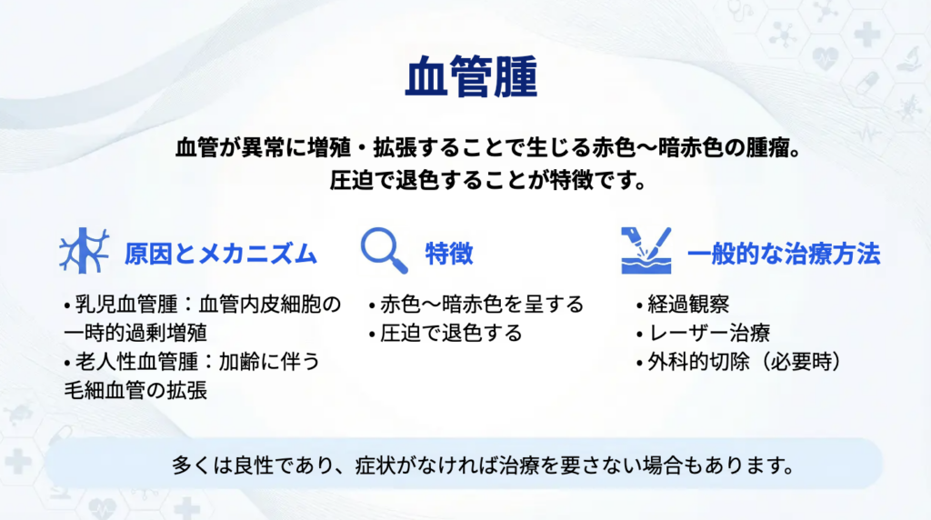 原因(成り立ち)はタイプによって異なります。代表的には、乳児期にみられる乳児血管腫と、成人以降に増えてくる老人性血管腫が知られています。前者は生後早期に出現し、増大期を経て自然退縮することが多い一方、後者は加齢に伴う毛細血管の変化として出現します。