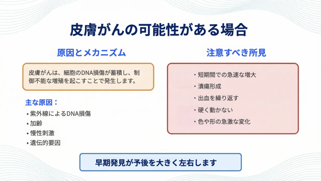 皮膚がんは、初期には良性病変と見た目が似ている場合もあります。しかし、進行に伴って「短期間での変化」や「皮膚の破綻(潰瘍・出血)」などが目立つことがあり、これらは重要な警告サインになります。特に、変化が数週間〜数か月の単位で起こっている場合は、自己判断で様子を見るのではなく、早めの評価が大切です。
