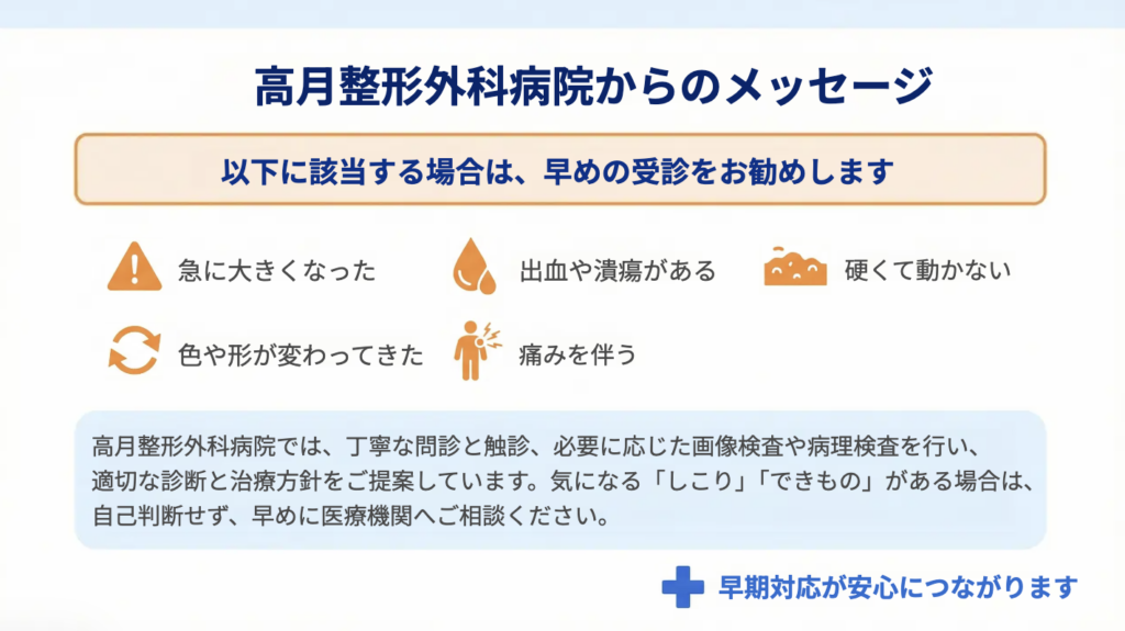 このような場合は自己判断で放置せず、早めに相談してください。高月整形外科病院の形成外科では、病変の性質を医学的に評価したうえで、適切な治療法と経過観察の方針をご提案します。