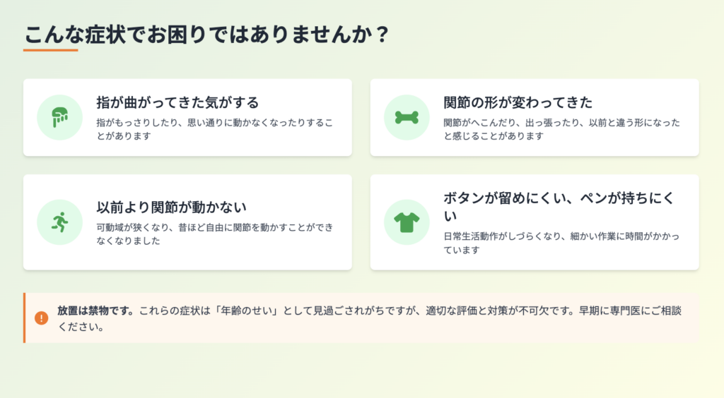 関節変形・構造障害は、「指が曲がってきた」「関節の形が変わってきた」「以前より動かない(可動域が狭い)」など、見た目や動きの変化として現れることがあります。