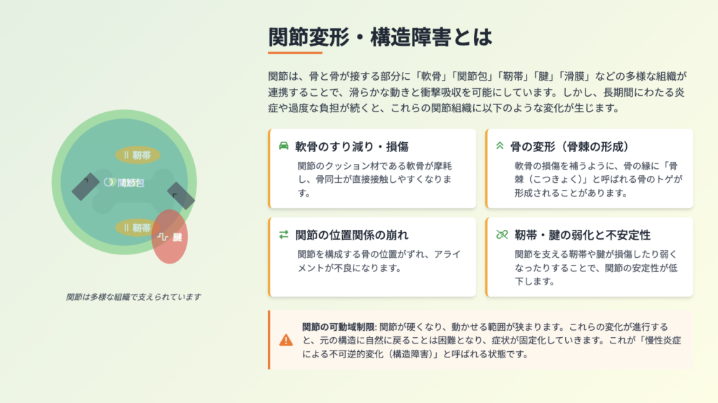 関節変形・構造障害とは、関節を構成する組織にダメージが蓄積し、関節の形や動きに「元に戻りにくい変化(不可逆的変化)」が起きている状態を指します。
