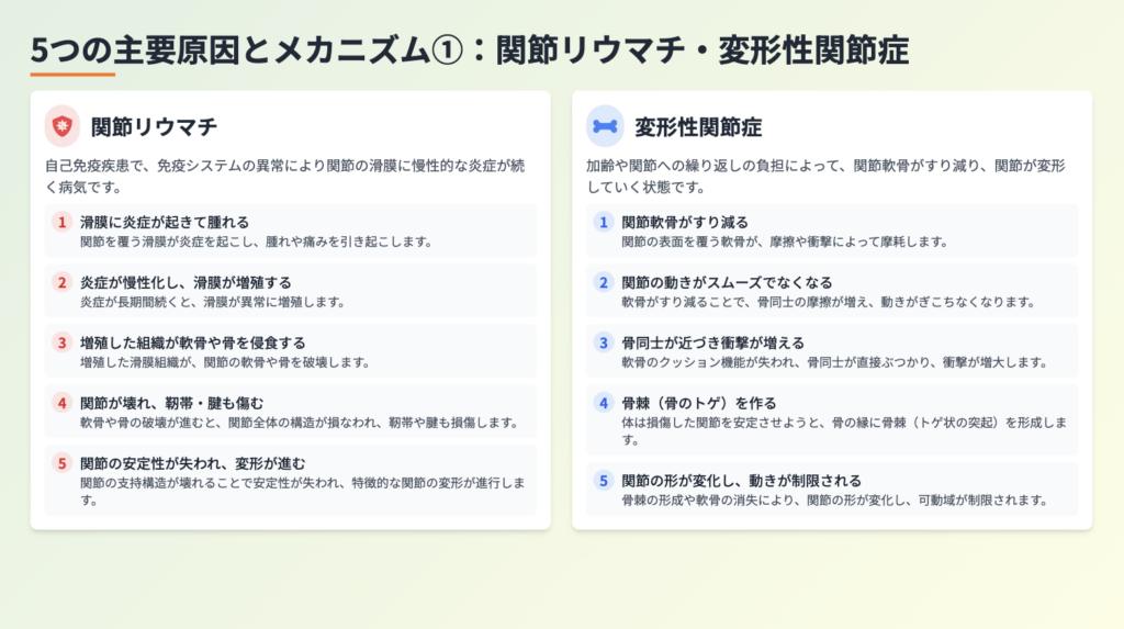 5つの主要原因とメカニズム①:関節リウマチ・変形性関節症