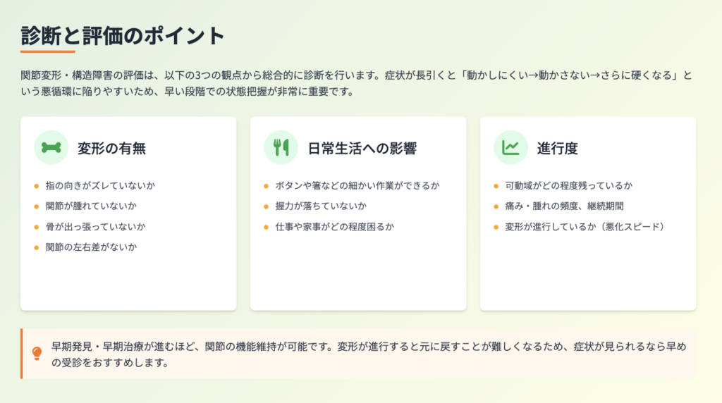 関節変形・構造障害の評価では、関節の形や可動域だけでなく、「生活で何がどの程度できなくなっているか」を確認することが重要です。