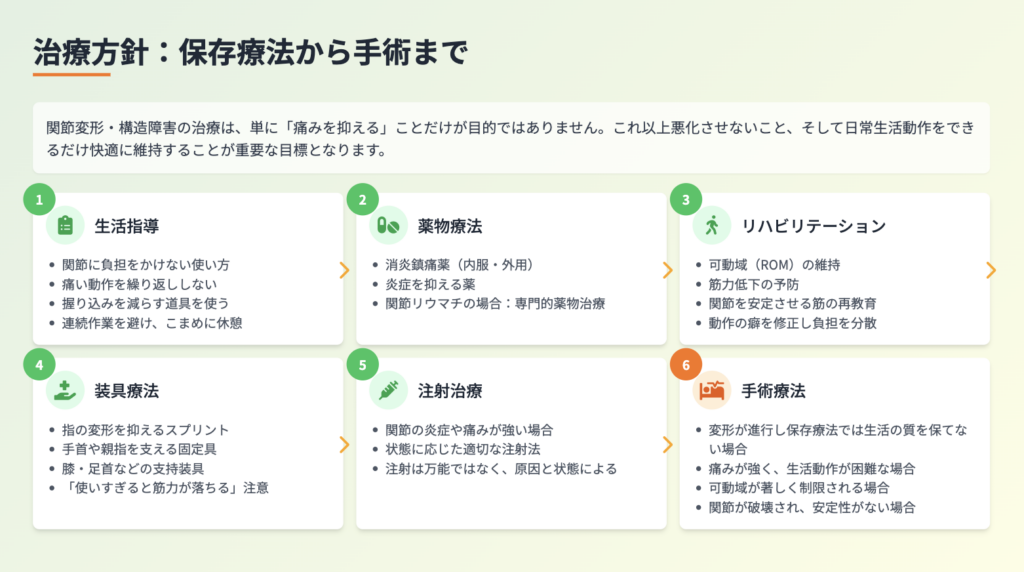 関節変形・構造障害では、まずは手術を急ぐのではなく、生活に合わせて負担を減らし、炎症と痛みをコントロールしながら機能を保つことが重要になります。