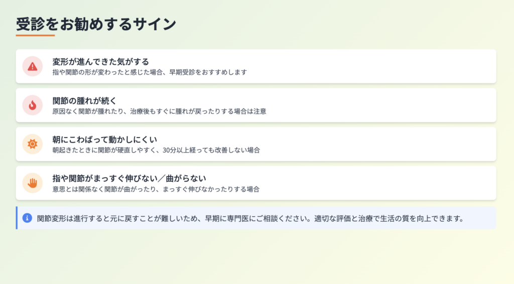 「指が曲がってきた」「関節の形が以前と違う」「出っ張りやへこみが気になる」と感じた場合は、早期受診をおすすめします。