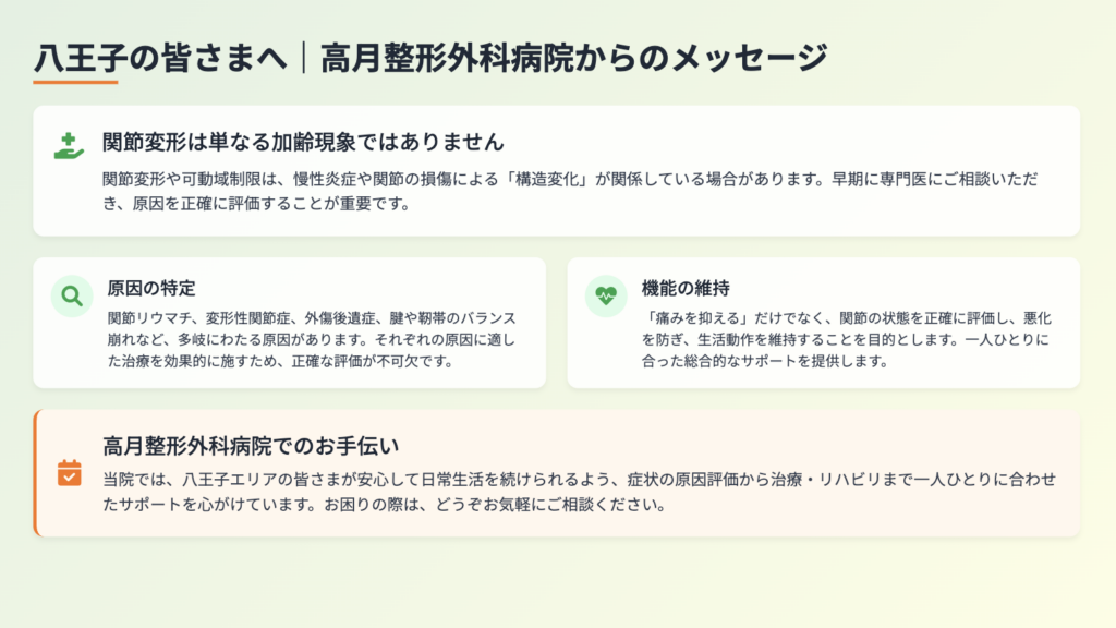高月整形外科病院では、八王子エリアの皆さまに向けて、整形外科の視点から関節の状態を評価し、必要に応じてリウマチ科の観点も踏まえながら原因を整理します。