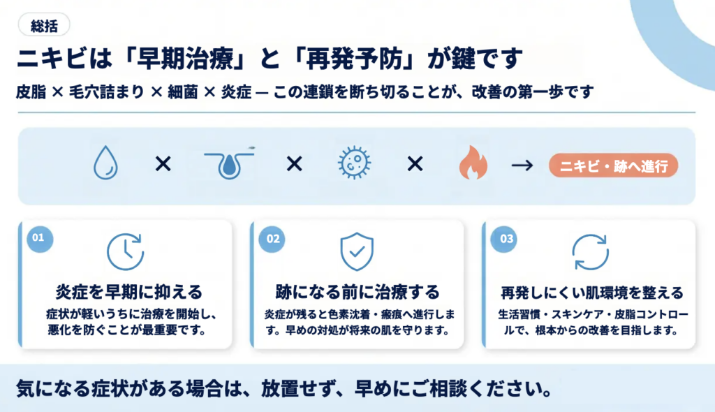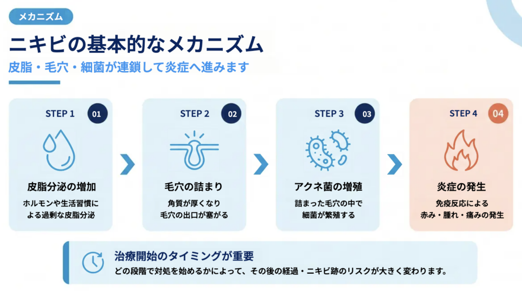 ニキビ治療では、症状が進行してから対応するよりも、早い段階で適切に治療することが重要です。
