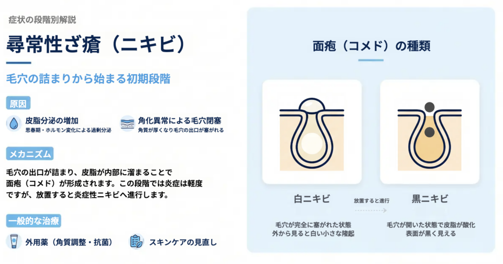 この時点では炎症は比較的軽度ですが、放置するとアクネ菌の増殖や炎症反応が進み、赤みや腫れを伴う炎症性ニキビへ進行することがあります。