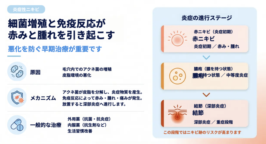 アクネ菌の増殖と炎症物質の影響により、体の免疫反応が起こると、炎症性ニキビへ進行します。