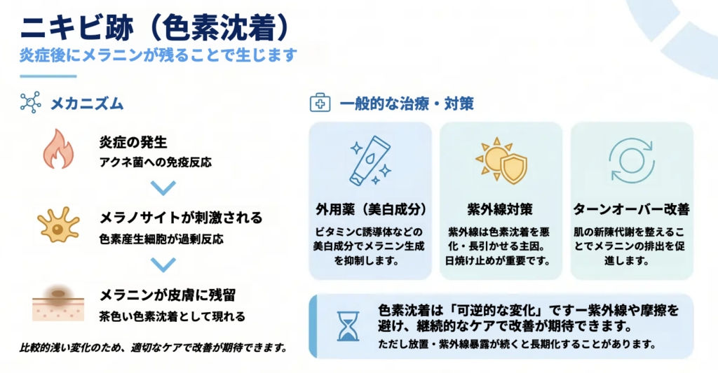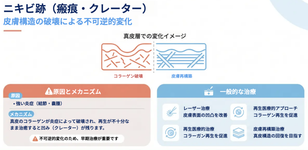 一方で、炎症が長引いたり、深い層まで進行したりすると、皮膚構造に影響が及び、治療に時間がかかるニキビ跡として残る可能性があります。