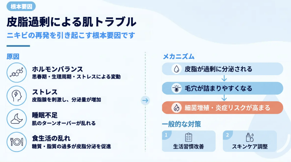 そのため、生活習慣、スキンケア、皮脂コントロールを見直し、根本から改善を目指すことが大切です。