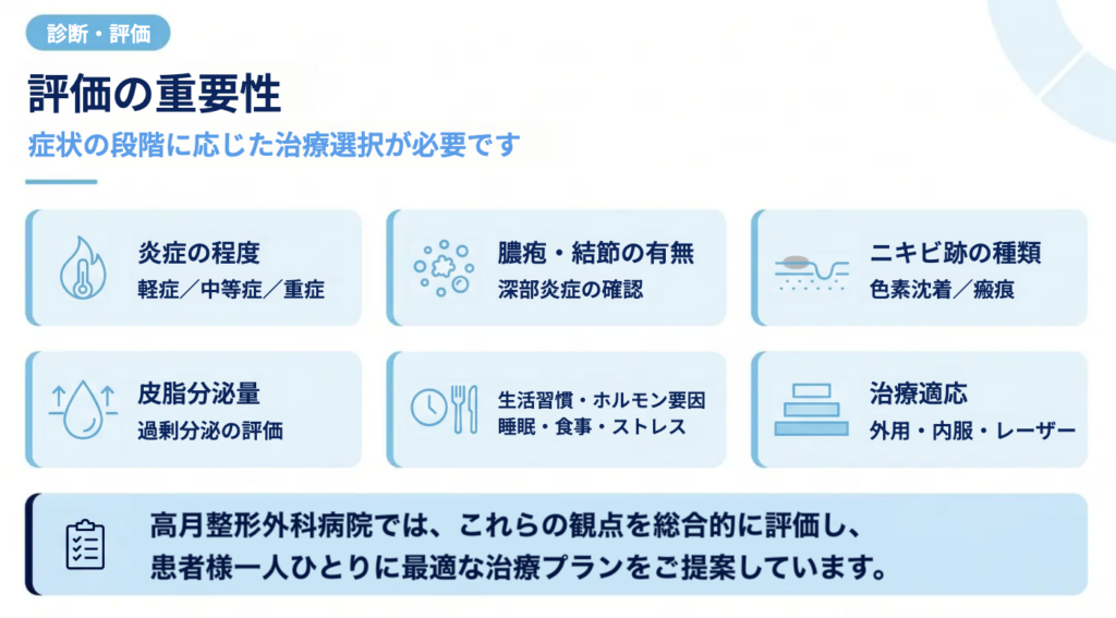 これらを総合的に確認することで、外用薬を中心に治療するのか、内服薬を併用するのか、あるいはニキビ跡に対してレーザー治療などを検討するのか、患者様ごとに適した治療方針を考えていきます。