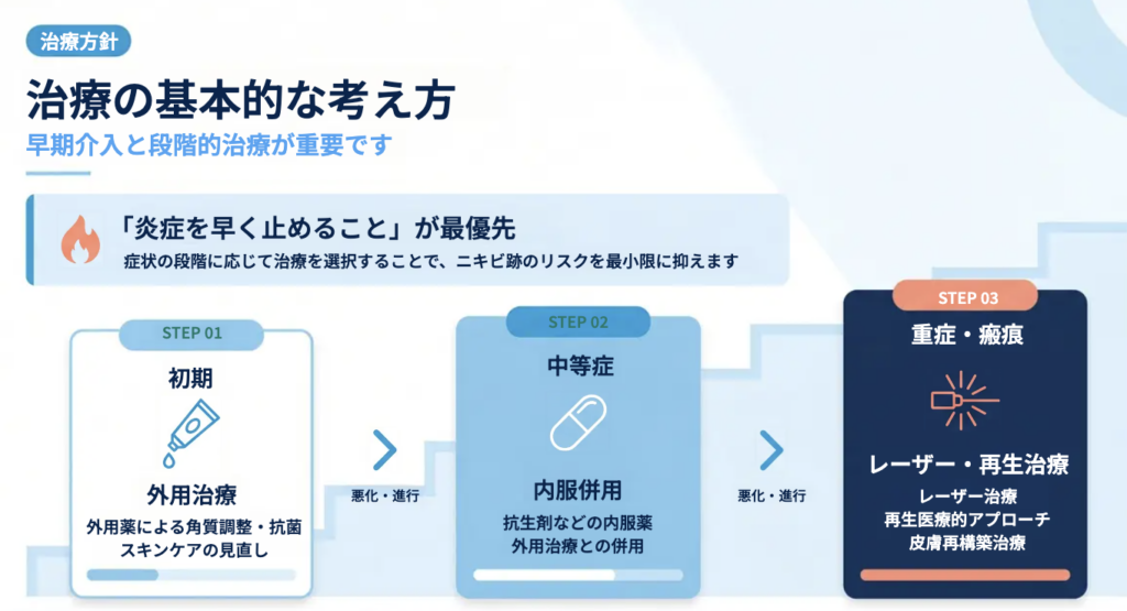 初期段階であれば外用治療やスキンケアの見直しを中心に進め、中等症では内服薬を併用し、重症・瘢痕段階ではレーザー治療や再生医療的アプローチを検討します。