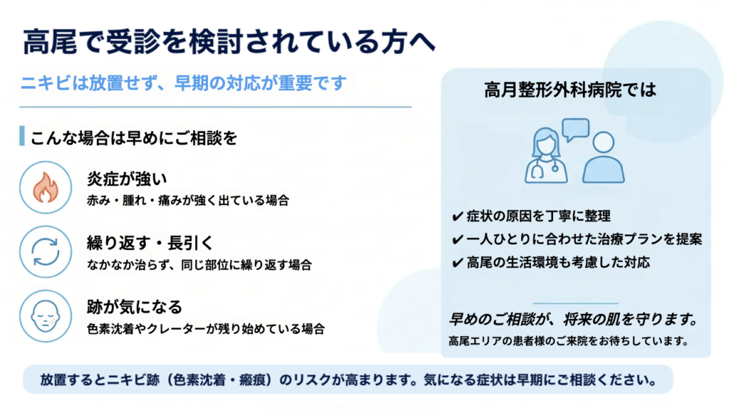高月整形外科病院の美容外科では、高尾の患者様に対して、ニキビを早期段階で見極め、炎症が強くなる前に適切な治療へつなげることを重視しています。