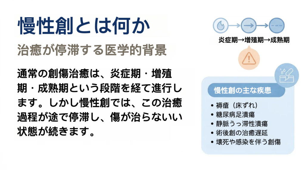 しかし、血流障害、圧迫、感染、糖尿病などの基礎疾患が関係すると、この治癒の流れが途中で停滞することがあります。このように本来進むべき創傷治癒のプロセスが途中で止まり、長期間にわたり傷が治らない状態が続くものを慢性創(慢性創傷)と呼びます。