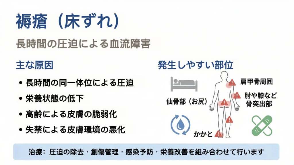 褥瘡は単一の原因で発生するわけではなく、局所の圧迫と全身状態の低下が重なることで発症することが多いとされています。