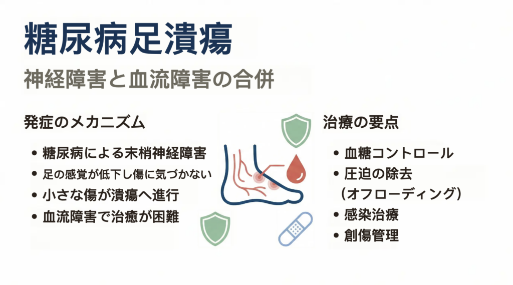 糖尿病足潰瘍の発症には、主に次のような医学的メカニズムが関係しています。