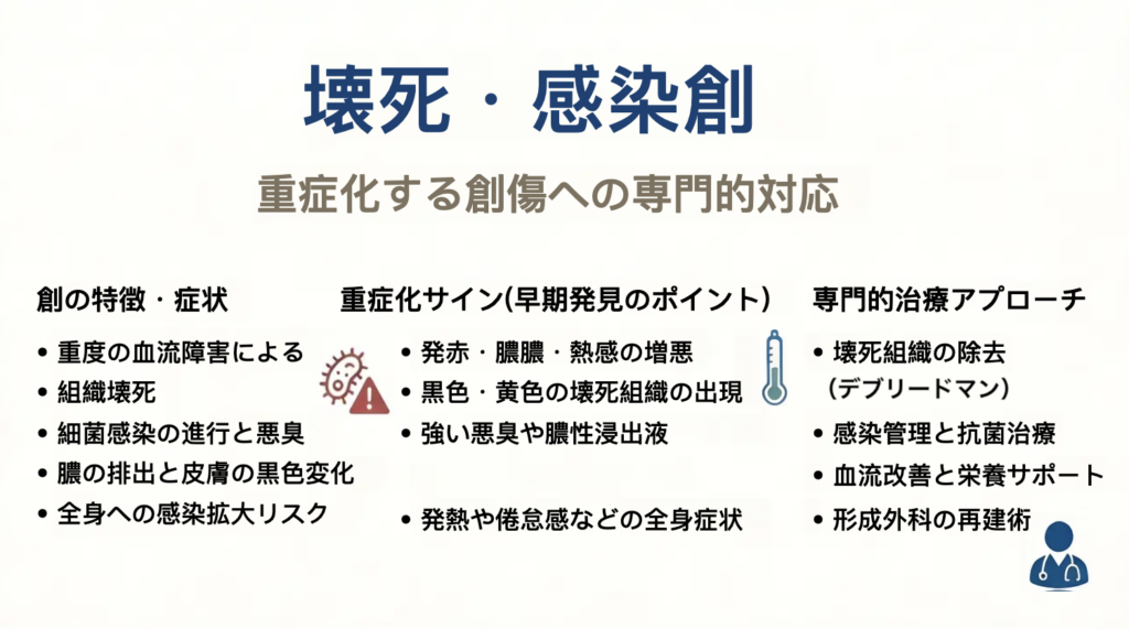 壊死・感染創とは、血流障害や細菌感染などが原因となり、皮膚や皮下組織の一部が壊死しながら進行する重症の創傷を指します。通常の創傷と異なり、組織が壊死した状態では自然治癒が進みにくく、感染が広がることで創部の状態が急速に悪化することがあります。