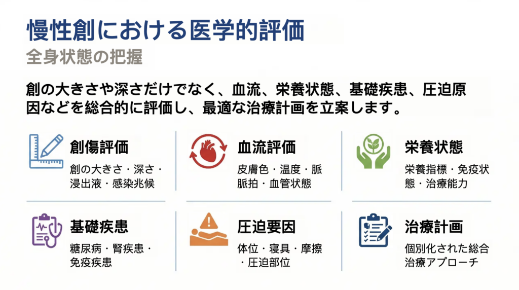 慢性創の治療では、単に創の表面を観察するだけではなく、創の状態、血流、栄養状態、基礎疾患、圧迫要因などを含めた多角的な医学的評価が必要になります。慢性創は、皮膚だけの問題ではなく、全身状態や循環機能、生活環境など複数の要因が複雑に関与して発生するためです。