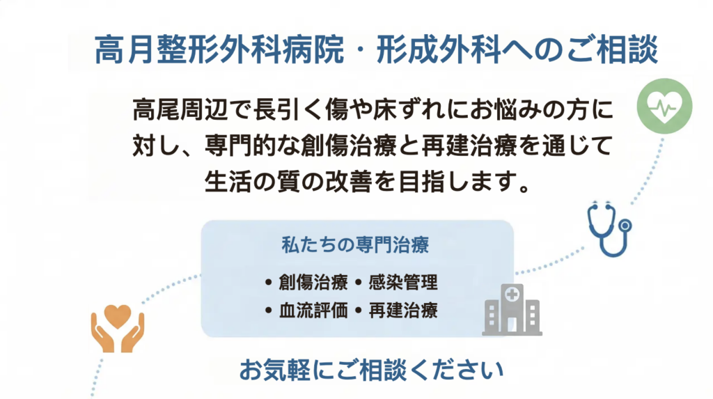 高尾周辺でも、長く治らない傷や繰り返す潰瘍などで悩まれる方が見られます。高月整形外科病院・形成外科では、こうした慢性創を単なる皮膚の傷としてではなく、血流状態・感染・基礎疾患・生活環境などを含めた総合的な医学的問題として評価することが重要であると考えています。