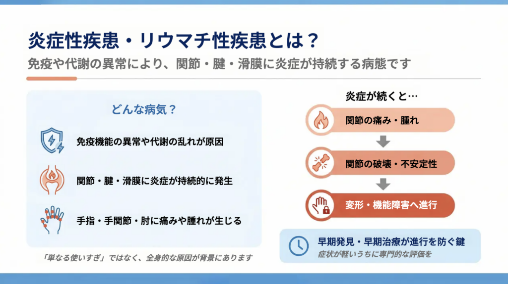 手指や手関節、肘にみられる痛みや腫れの中には、単なる使いすぎや加齢性変化だけでは説明できないものがあります。その代表が、炎症性疾患やリウマチ性疾患です。これらは、体の免疫機能の異常や慢性的な炎症反応によって、関節の内側にある滑膜、関節を支える腱、腱鞘などに障害が生じる病態であり、進行すると痛みだけでなく、こわばり、腫脹、可動域制限、さらには変形や不安定性につながることがあります。