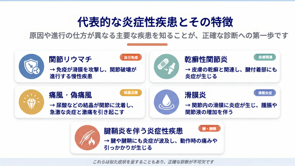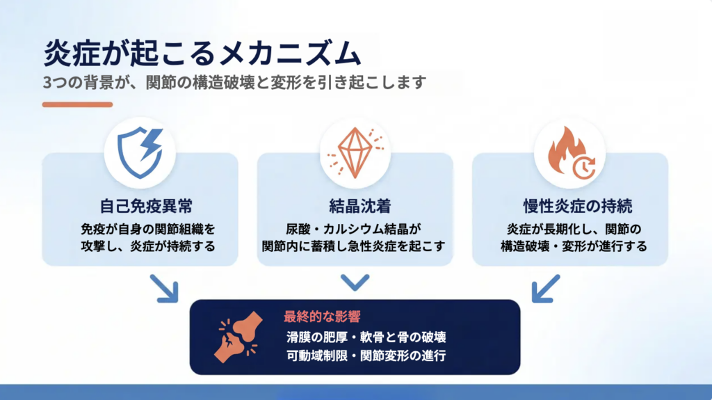 これらの疾患では、体を守るはずの免疫が自分自身の組織に反応したり、体内の代謝異常によって炎症の原因物質が蓄積したりすることで、関節や腱、滑膜に炎症が繰り返し起こります。