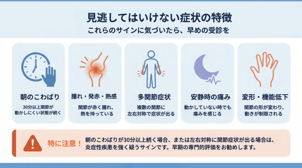 さらに、炎症性疾患では症状の出方にも特徴があります。たとえば、朝に手がこわばりやすい、複数の関節に症状が出る、腫れが長く続く、痛みが出たり引いたりを繰り返すといった経過をたどることがあります。こうした特徴は、一般的な腱鞘炎や使いすぎによる痛みとは異なる重要な手がかりになります。