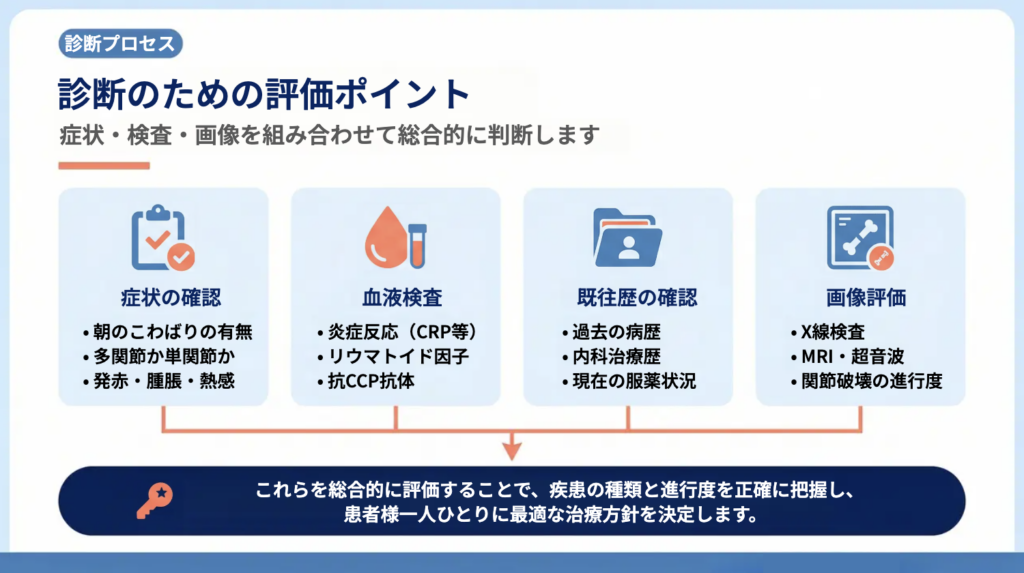 画像検査は、関節の構造変化や炎症の程度を客観的に把握するために重要です。